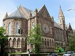 Battell Chapel is the largest chapel of Yale University in New Haven, Connecticut. Built in 1874–76, it was funded primarily with gifts from Joseph Battell and others of his family. Succeeding two previous chapel buildings on Yale's Old Campus, it provided space for daily chapel services, which were mandatory for Yale College students until 1926 (all-male, mostly Protestant).[1] Together with Durfee Hall and Farnam Hall, the chapel was part of a program begun in the 1870s to build up the perimeter of Old Campus and separate it from the rest of the city. These three buildings, all by the same architect, were among the first at Yale to be named for donors rather than function, location, or legislative funding.