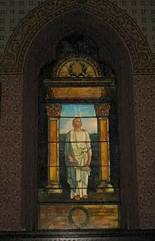 The Apse Memorial Windows were designed by the architect Russell Sturgis and installed by Slack, Booth & Co. of Orange, New Jersey in 1876. At the top of the center window appears the name of an early benefactor of Yale University, Elihu Yale, and around his name are the names of the first nine presidents of Yale College. Stained-glass windows flanking the nave commemorate benefactors and professors of Yale, many of whom were theologians. These include George Berkeley, Jonathan Edwards, Benjamin Silliman, James Luce Kingsley, Chauncey A. Goodrich, Nathaniel W. Taylor, Eleazar Thompson Fitch, Denison Olmstead, Edward C. Herrick, William A. Larned, Anthony D. Stanley, and James Hadley.[2]