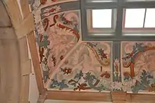 To the functional layout of the building, Mountford introduced what were for him was a signature feature: the blending of the architectural with sculpture and painting. Woodwork panelling, floors and dado rails are of oak; highly decorative ceilings and friezes in the council chamber and the grand hall of fibrous plaster were provided by Gilbert Seale of Camberwell. Floors feature mosaics with emblematic bees, signifiers of the industry of the parish, by Rust's Vitreous Mosaic Company of Battersea. Relief sculptures by Horace and Paul Montford adorn pediments at the front and side of the building; to the east, Labour and Progress; to the west, Art and Literature, and in the centre, Justice and Prudence flank the crest and arms of the Parish, and Authority and Relaxation (alternatively called Government and Entertainment) feature to either side of the first-floor central window, personifications of the twin purposes of the building. Putti (cherubs) feature on the main entrance spandrels and the lunettes of windows and doors. An elaborate curved frieze featuring cartouches, swags and more putti adorn the staircases - themselves in Devonshire and Sicilian marble. The glass dome above the octagonal hall features a garden-pattern in shades of yellow.[15]