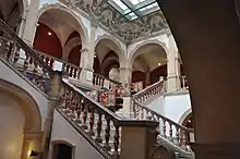Within the ceremonial front block of the hall, an imperial staircase rises to a gallery on three sides; the council chambers and a public viewing area, a committee room and members' library occupy the front of the first-floor space, and a series of offices are provided along the east and west of the ground-floor of the block. A small courtyard serves as a light-well.[16]