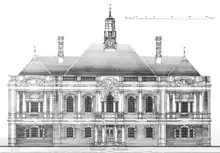 Mountford's design provided a symmetrical 112 feet (34 m) building frontage in Monks Park (Bath) stone and red Suffolk bricks, having 5 central bays including a semi-circular Ionic portico, and single bay pavilions with curved-corners to left and right. At the front, upper windows are in a Venetian style, whilst the lower windows have rusticated or Gibbs surrounds.[16] The building has hipped roofs, originally of Westmoreland slate, incorporating turrets of oak covered with copper and surmounted by wrought iron.[17]