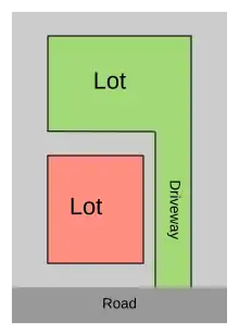 In real estate, a battle axe block, hammerhead block,[1] hatchet block or flagpole block[2] is a block of land situated behind another, with access to the street through a narrow driveway shared by both properties.[3] They are named for their distinct L-shape, which is said to look like a battle axe, hammer, hatchet or flagpole from above. Battle axe blocks are often the result of property developers subdividing a long block of land widthwise, with the rear section becoming a battle axe block.