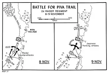 On the night of 5–6 November, the Marines drove off two preliminary attacks from the Japanese 23rd Infantry Regiment.[8] Colonel Edward A. Craig, commander of the 9th Marines to which 2nd Raider Battalion was attached,[9] surmised that this was just a preparatory action and brought up more Raiders to reinforce the roadblock. When the Japanese attacked the following afternoon (7 November), the Marines were ready and drove the Japanese back to Piva village. Early on the morning of 8 November, Major General Shun Iwasa, commander of the Japanese 6th Division's infantry group (the Iwasa Detachment),[10] renewed the attack with two full battalions. The Americans brought up men of the 3rd Raider Battalion to protect the flanks of the Marines already engaged, as well as some light tanks. Frontal attacks by the Japanese were repulsed.[11]