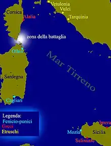 The naval Battle of Alalia took place between 540 BC and 535 BC off the coast of Corsica between Greeks and the allied Etruscans and Carthaginians. A Greek force of 60 Phocaean ships defeated a Punic-Etruscan fleet of 120 ships while emigrating to the western Mediterranean and the nearby colony of Alalia (now Aléria).