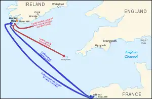 The newly appointed commander-in-chief of the English main fleet, Arthur Herbert, did not go to sea until the beginning of April, leaving behind a number of ships which had mutinied for overdue pay.[9] Herbert's fleet of 19 ships sailed on 4 April; it was off Cork by 12 April, seeking to intercept enemy vessels. The French fleet, consisting of 24 third- and fourth-rate vessels, two frigates, a number of fireships, and transports carrying weapons and supplies for James’s campaign, left the port of Brest on 6 May.[2]