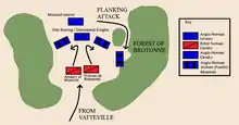 Odo decided to dismount most of his knights, including himself, contrary to the conventional mounted tactics employed by knights of the time.[2] Furthermore, he placed 40 archers on the front line to weaken the enemy cavalry before they could reach his force, specifically by targeting their horses.[5] Some primary sources of the battle also claim that the English had horse archers that were used to flank the enemy; however, this was extremely rare in western Europe at the time and is considered unlikely.[5] Waleran's plan of attack was simply to charge the English line with his mounted knights, which he attempted to do.[1] The English archers fired their arrows continuously as the rebels charged, unhorsing most of them before even making contact with the English knights on foot.[4] Presumably, the mounted cavalry that were held in reserve were immediately tasked with chasing down any fleeing enemies and were able to capture them, including Waleran himself.[5]