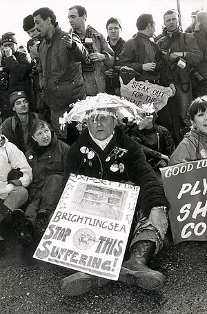 In January 1996 Tilly Merritt, a 79-year-old woman from Brightlingsea, was convicted of assaulting Police Constable Kevin Conermey after spraying him with water from a garden hose during the protests in February 1995.[98][99][100][101] She was sentenced to 2 days imprisonment when she told magistrates at Colchester that she refused to pay the £302 fine. Well-wishers paid the fine while she was waiting for the prison van to take her to HM Prison Holloway, and she was released.[102][103]