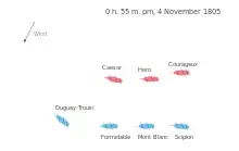 The damage his ships had sustained rendered them slow and unmanoeuvrable, and Strachan was able to order his ships to tack themselves, to keep them alongside the French, while adding Namur to his line.[9] Under heavy fire from the frigates on the starboard side and the ships of the line on their port, the French ships were worn down and by 3.10 Scipion and Formidable had been forced to strike their colours.[10] Seeing their fate Mont Blanc and Duguay-Trouin attempted to escape but were chased down by Hero and Caesar and battered into submission by 3.35.[9][10]