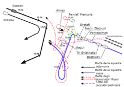 On the morning of 17 November 1914, a Russian force consisting of the pre-dreadnought battleships Evstafi (the flagship), Ioann Zlatoust, Panteleimon, Tri Sviatitelya, Rostislav, three cruisers, and 13 destroyers under Vice Admiral Andrei Eberhardt struck the Ottoman port of Trebizond.[2] German Admiral Wilhelm Souchon decided to intercept it as it returned to port. At 13:00 the Ottoman battlecruiser Yavuz Sultan Selim and the light cruiser Midilli sortied from the Bosporus for Sebastopol at high speed.[3] Eberhardt was aware of the Ottomans' departure from port and thus alert for an attack.[4]