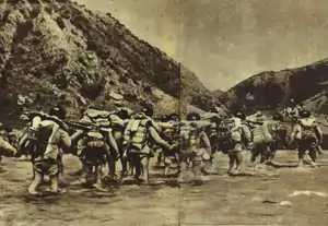 After months of failed negotiations,[14] attempts by Lhasa to secure foreign support and assistance,[21] and the troop buildups by the PRC[22] and Tibet,[23] the PLA crossed the Jinsha River on 6 or 7 October 1950 into Lhasa-controlled Chamdo, crossing the de facto border[24] at five places.[25]