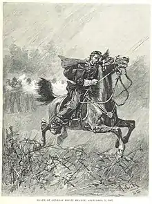A severe thunderstorm erupted about this time, resulting in limited visibility and an increased dependence on the bayonet, as the rain soaked the ammunition of the infantry and made it useless. Kearny arrived about this time with his division to find Stevens' units disorganized. Perceiving a gap in the line he deployed Brig. Gen. David B. Birney's brigade on Stevens's left, ordering it to attack across the field. Birney managed to maneuver close to the Confederate line but his attack stalled in hand-to-hand combat with Maj. Gen. A.P. Hill's division. Kearny mistakenly rode into the Confederate lines during the battle and was killed. As Kearny's other two brigades arrived on the field, Birney used the reinforcements as a rear guard as he withdrew the remainder of the Union force to the southern side of the farm fields, ending the battle.[9]