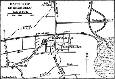 Worth's division took on the tête de pont, while Twiggs took on the convent.[1]: 298 Rincón's gunners were able to force Taylor's battery to withdraw,[1]: 298 and Perez's defense on the tête de pont twice repulsed Major Benjamin Louis Eulalie de Bonneville's 6th Infantry charge.[1]: 298 The attack by Franklin Pierce and James Shields, crossing the river on the Coyoacan-Mixcoac road in an attempt to cut off the Mexican retreat, was also stopped.[1]: 298 However, Worth turned the Mexican left and crossed the river, while the 8th and 5th Infantry took the tête de pont.[1]: 300 Captain Duncan then set up a battery to attack the convent.[1]: 300