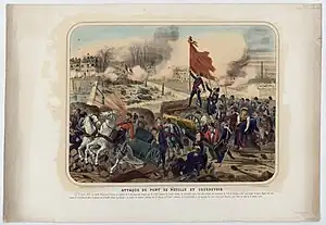 Galliffet returned with two brigades on 2 April to attack Courbevoie's Rond-Point. A Versaillais military surgeon general, attempting to negotiate, was killed on approach by Communards who mistook his uniform for that of a colonel. A battle ensued.[2]