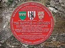Red plaque of the Battle of Crogen, unveiled in 2009; it has been suggested that the engagement might be better regarded as a "series of minor harassments"[8] than a single battle.