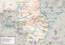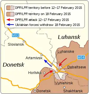 The Battle of Debaltseve was a military confrontation in the city of Debaltseve, Donetsk Oblast, between the pro-Russian separatist forces of the Donetsk People's Republic (DPR) and Luhansk People's Republic (LPR), and the Ukrainian Armed Forces, starting in mid-January 2015 during the war in the Donbas region. The Russian forces composed mostly of "Wagner Group" soldiers[34] recaptured Debaltseve, which had been under Ukrainian control since a counter-offensive by government forces in July 2014. The city lay in a "wedge" of Ukrainian-held territory bordered by the DPR on one side, and the LPR on the other, and is a vital road and railway junction.[35]