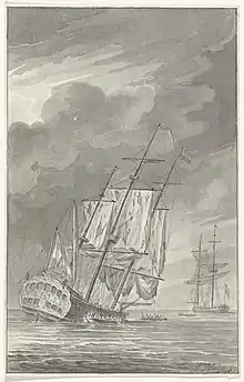 The Dutch were politically in turmoil, and were consequently unable to mount any sort of effective actions against the British.[5] The result of this inaction was the collapse of their economically important trade.[6] It was finally decided that a merchant fleet had to be launched. On 1 August 1781, Admiral Johan Zoutman led a fleet of some 70 merchantmen from the Texel, protected by seven ships of the line as well as a number of frigates and smaller armed vessels. Admiral Sir Hyde Parker was accompanying a convoy of ships from the Baltic when he spotted the sails of the Dutch fleet at 04:00 on the morning of 5 August. He immediately despatched his convoy toward the English coast, and ordered his line to give chase rather than prepare for battle.[7]: 48 Zoutman, whose ships had been interspersed with the merchantmen, signalled his line to form in between Parker and the convoy. The ships of Parker's fleet were not in the best of condition, since great demands were placed on the Royal Navy by the demands of the war, and all manner of ships were pressed into service, or did not receive necessary maintenance. Some ships were in such poor condition that the number of guns available to fire was reduced from its normal complement. The ships had had no time to practise the normal fleet manoeuvres.[7]: 46 In spite of this, Berwick and Parker's flagship Fortitude, both 74 guns, were both relatively new and in good shape. The Dutch crews were inexperienced as they had not seen any significant action due to the British blockade.