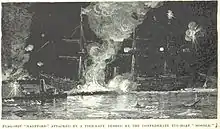 The Confederate fleet did very little in this stage of the battle. CSS Louisiana was finally able to use her guns, but with little effect.[44] The armored ram CSS Manassas came in early and tried to engage the enemy, but the gunners in the forts made no distinction between Manassas and members of the Federal fleet, firing on friend and foe indiscriminately. Her captain, Lieutenant Commander Alexander F. Warley, therefore took his vessel back up the river, to attack when he would be fired upon by only the Union fleet.[45]