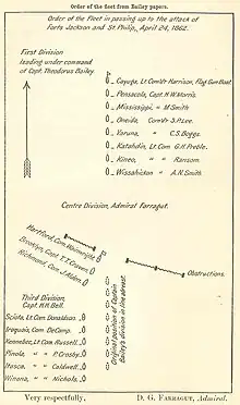 Having resolved to pass the forts, Farragut somewhat modified his fleet arrangements by adding two ships to Captain Bailey's first section of gunboats, thereby eliminating one of his ship sections. After the alteration, the fleet disposition was as follows:[42]