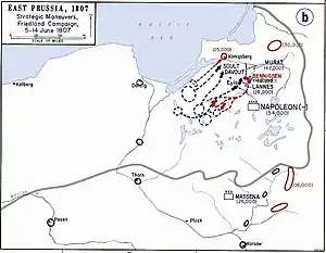 - ↑ Nicholls D. Napoleon: A Biographical Companion. ABC-CLIO. 1999. P. 105: "Some 50,000 Russians under Levin von Bennigsen faced 80,000 of the Grande Armée".