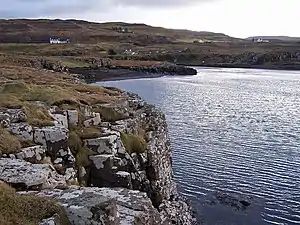 According to MacLeod tradition preserved in the Bannatyne manuscript, a force of MacDonalds led by Donald Gruamach MacDonald, landed on Skye at Loch Eynort, in about the year 1490. The MacDonalds proceeded to lay waste to the lands of Minginish, Bracadale, and Duirinish; and their forces got right up to the gates of Dunvegan Castle. The manuscript states that during this time, the chief of the MacLeods of Harris and Dunvegan, Alasdair Crotach, was on Harris; but that upon hearing the news of the MacDonald's encroachments, he proceeded with all haste to Skye. The manuscript states that he landed at Glendale, where he was joined by his kinsmen, the MacLeods of Lewis.[1] The historian J.L. Roberts noted that they would have landed at the head of Loch Poolteil, where the Glendale valley reaches the sea.[2] The manuscript continues, that the combined MacLeod forces drew up on the brow of a hill, with a river in front of them which made it difficult for the MacDonalds to attack.[1]