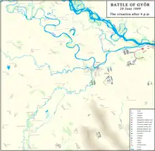 On 27 June Görgei learned that the Austrian army was preparing to attack along the line of the river Rába, and during the evening he was informed that the imperials had crossed the river, cutting the Kmety division from the VII Hungarian corps.[8] The imperials encircled the positions of the VII corps, intending a concentric attack the following day. Knowing this, Görgei departed that night towards Győr.[8]