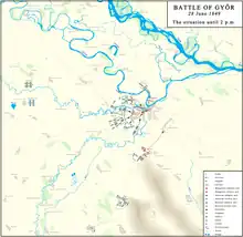 After 21 June, Görgei was both the commander-in-chief of the Hungarian army and the Minister of Defence of Hungary in the Szemere-Government. He was often forced to travel between Pest and his general staff office in Tata.[5] On 24–26 June he was in the capital, participating in a ministry council. He convinced the government to accept his plan of gathering all Hungarian forces (except of those of Transylvania and Southern Hungary) around Komárom, in order to achieve numerical superiority. He proposed to attack Haynau's troops and march against Vienna. Should that fail, he would retreat to Komárom. The cause of this desperate plan was the fact that on 15 June Russian troops crossed Hungary's borders, entering with 193 000 soldiers and 584 cannon.[6] This joined the 165 000 Austrian soldiers with 770 cannon against the 150 000 Hungarians and their 857 cannon (464 field cannon and 393 fortification cannon).[7] Görgei realised that the Hungarians had no chance to win, unless they destroyed Haynau's Austrian forces before the Russian troops arrived.[5] In the ministry council held in the evening of 26 June, despite the majority's anti-Görgei feelings, his plan was accepted.[5] On the morning of 27 June, Görgei returned to take over the leadership of the troops, having heard about the concentration of the imperial troops near Győr.[8] The imperials planned to encircle the Hungarian troops in Győr, forcing them to surrender. Failing that they planned to split the Kmety division from the Hungarian VII corps led by Ernő Poeltenberg, and to force them to evacuate the city.