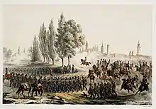 On the morning of 28 June, at 9 a.m. the battle started at Szemere, where the division led by Lieutenant Colonel Ferenc Liptay was attacked by the Austrian III corps.[19] The vanguard of the III. corps was represented by the Wolf brigade. Colonel Karl Wolf von Wachentreu sent the 22. kaiserjäger, 2 cavalry companies, and a ½ battery to attack from the front, while another unit with the same strength tried to encircle the Hungarians.[12] After an artillery preparation, the 22. battalion attacked the Liptay division positioned on a height southeast of Szemere, pushing them back to the edge of the village, but from here they were forced to retreat to the heights behind the Bakony creek, after dismantling the bridge.[12] Now Wolf sent his artillery to the Bakony creek, against which Liptay sent 4 companies of hussars, covered by 4 cannons,[9] but the fire opened by the Austrian artillery and infantry, forced them to retreat to their starting position.[12] Meanwhile, despite the Hungarian artilleries fire, the Austrians rebuilt the bridge over the Bakony, then Wolf's battery managed to cross over it.[12] The rest of the III. corps too crossed the Rába river at Babót, and arrived at Szemere, while a strong Austrian column, which crossed the Rába at Bodonhely, was marching towards Ménfő, which forced the division led by Lieutenant Colonel Ferenc Liptay to retreat towards Kismegyer,[lower-alpha 5] to take a position between Ménfő and Csanak, in order not to be separated in the same way as Kmety was a day before, from the Hungarian forces defending Győr, while the hussars covering the retreat fought continuously with the Austrian chevau-légers.[19][12] When the Liptay division arrived to Csanak, they encountered there another Austrian column, the Schneider brigade, which, after crossing the Rába at 5:00 a.m., headed, through Szarkavár[lower-alpha 6] towards Ménfő.[12] To defend the flank and the back of the Hungarian positions from Győr, Liptay deployed his troops between Mánfő and Csanak, positioning the infantry on the left flank, on the vineyards, and the cavalry and artillery between these heights and the Rába.[12] But his chances of resisting against the twice numerous enemy, on a disadvantageous (marshy) terrain, were bleak.[9] Schneider sent his infantry against the Hungarian infantry from the left flank, while with his 6 companies of uhlans he attacked the 4 Hussar companies and the Hungarian artillery. The uhlans' attack was so successful that they captured a battery together with an ammunition wagon, forcing Liptay to retreat again from this position. Schneider decided to remain at Csanak, and did not pursue him.[12]