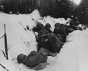 On the south side of the road, two U.S. squads crawling on their stomachs found a way through the well-emplaced German guns and cut the barbed wire to forge a path between the German defenses. They penetrated a trench line behind the pill boxes and held off German patrols for five hours, but when darkness fell they returned to the American lines. On December 15, an American patrol advanced once more through the breach in the barbed wire and captured a portion of the trench line. They alerted the regimental command post, and Lieutenant Colonel Walter M. Higgins, Jr., commanding officer of the 2nd Battalion, led two companies of GIs into the trenches behind the pill boxes. By the early morning of December 16, they gained control of several pillboxes, but did not have sufficient TNT on hand to destroy them.[6] On December 16, the 9th Infantry Regiment pressed the attack another 1,500 yards (1,400 m) against stubborn resistance and captured the crossroads and the road network around it.[6]