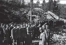 By 10 April, Holtermann already had fifty volunteers under his command and a steady stream of mostly local men kept being drawn to the fort.[20] On 11 April, men of Holtermann's unit returned to Værnes to remove more of the materiel and provisions stored there. Due to poor security amongst the German forces stationed at the camp, the Norwegians were able to carry out their mission undetected. The reclaimed supplies were taken partly to the fortress and partly to a number of nearby farms.[21] When a force of 250 soldiers had been assembled, Holtermann had to turn away further volunteers due to the fact he could not arm or equip any more soldiers than those he already had under his command at that point. From 12 April work was carried out to reactivate the fortress's artillery, which was found to have plentiful ammunition, but no direction systems or charts for indirect fire.[21] Only a few 1:100,000-scale maps were available at the fortress.[22] The actual artillery charts for the fortress were stored in Trondheim and fell into the hands of the Germans on 9 April and were used by the Wehrmacht during the siege to deploy artillery in places that the fortress could not hit. The same day troops of Holtermann's unit were positioned around Hegra railway station and Mælen bridge, and the first German attempt at making the fortress surrender was carried out. A German Major approached the fortress together with two Norwegian officers who had given up the same day. Despite the best efforts by both the German officer and the two surrendered Norwegians, Holtermann refused to capitulate.[23] The next day, 13 April, Major Holtermann achieved contact with his superiors at the 5th Division for the last time during the Norwegian Campaign. Through a telephone conversation, the commander of the force at Hegra was told to act as he saw best and, if possible, to hinder the Germans in gaining control of the Meråkerbanen railway line to Sweden. In response to these orders, 20 soldiers were sent to the village of Flornes to set up field fortifications and block the road and railway to Meråker.[24]