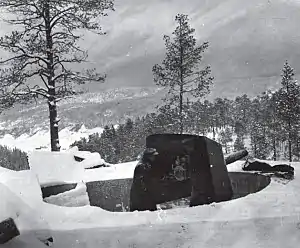 News came in over the radio on 2 May of the Allied retreat from the Åndalsnes area, that the Germans had seized control of the Dovre Line from Dombås to Støren, and of the surrender of the Norwegian 4th Brigade in Western Norway. This came on top of increasing supply problems, with the bread supply already having run out on 30 April. The next day, 3 May, the garrison started destroying its artillery ammunition in preparation for surrender.[52] The three Swedish volunteers that had endured the siege with the Norwegians were released from their duties and guided across the mountains to the Swedish border by a ski patrol. During the day, a radio message from Colonel Ole Berg Getz—the Norwegian commander in the Trøndelag area—was broadcast. Getz had surrendered his forces in Nord-Trøndelag and advised all Norwegian forces in Trøndelag to lay down their arms as the situation had become hopeless after the British retreat from the southern parts of Norway. The decision to surrender Trøndelag had been influenced by Neville Chamberlain's radio message that day announcing the end of the Allied campaign in Southern Norway.[53] On 4 May, destruction of radios, machine guns, carbines and other small arms was initiated and ski patrols were sent out carrying loads of important documents. By 13:50 that day confirmation of Colonel Getz's capitulation was received and the destruction of the fortress's artillery began.[54]