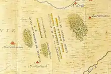 ![]() Battle of Mergentheim (“Mariendal” in the drawing), or Battle of Herbsthausen, of 1645. Plan of action, French depiction. | |||||||