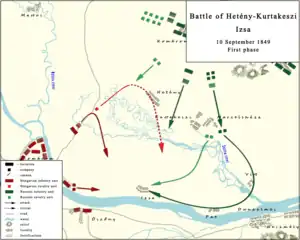 But the vigilant Cossacks thwarted this enterprise, and after a skirmish forced the hussars to retreat.[1] Then between Hetény and Kurtakeszi, the Russians deployed 2 infantry battalions, 4 uhlan companies, and 12 guns.[1] Battle of Hetény-Kurtakeszi-Izsa from 10 September 1849 - first phase. This shows that the Russians wanted to set a trap to the Hungarians, trying to make the Hungarian troops believe that the place is not properly defended, then, with considerable forces, to crush them.