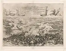 When Orange met Genlis, he found the Huguenot army was disappointingly small, numbering about 2,000 infantry and 500 cavalry (estimates of the total vary between 2,000 and a probably exaggerated 5,800).[21] That was not even enough to provide a decisive advantage over Alva. Seeking a way back to Germany before the winter, Orange would be refused passage through the Prince-Bishopric of Liège. Orange and Alva would fight again at the Battle of Le Quesnoy. Orange's army would pass through France to Strasbourg, where Orange paid off most of his army. Alva took revenge on the towns that supported Orange. For example, the burgomeisters of Leeuw were sentenced to death for yielding to Louis, even though they had sent their garrison as ordered to reinforce Thilmont. His generals managed to persuade Alva that was unjust, so he commuted the sentence to executing just one of them.[22] To the north of the campaign, the town of Diest, owned by William of Orange, had sent provisions to support Orange's army. As punishment, the town had to fund a tercio of the Army of Flanders and some years later, in 1572, the Spanish King Philip II confiscated Diest, destroying its fortifications.[23]