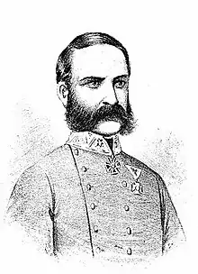 On June 12, 1848, the troops under the command of Colonel David Kräutner von Thatenburg set off from Pétervárad at 3 o'clock in the morning.[5] Who effectively commanded these troops was Captain Miksa Stein (1810-1860). His detachment consisted of 8 infantry companies: from the 39th Don Miguel and the 32nd Franz Ferdinand d'Esté Infantry Regiments seven companies; and one company of the Landwehr battalion from Pétervárad, 46 horsemen of the Imperial Hussars (forming one of the wings) and a six-pounder battery. These troops were mostly composed of Hungarians.[9] This totalled 1100 people.[9] Hrabovszky's orders were for a military column to march to Karlóca, but at the same time, under Józseffalvalva (Hr. Josipovac)... a more vigorous demonstration is to be made.[9] Hrabovszky was prepared for one last eventuality. He ordered Captain Miksa Stein that "... if the insurgents are willing to reconcile, they should be given time to discuss [with the Hungarians]", and that hıs troops should only use weapons if they were attacked.[9] Beside Stein's troops, at the same time, Hrabovszky sent a column of some 5,000 men against the Roman trenches.[7]