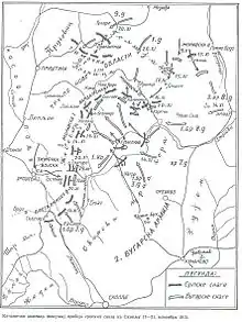 Mackensen ordered an all-out pursuit by the Bulgarians southwest toward Priština. However, the Bulgarian First Army was having difficulties in getting all of its units across the West and South Morava Rivers.[14] On 10 November, the Bulgarian First Division was able to cross the South Morava at Leskovac, about 18 miles south of Niš, but a Serbian force consisting of the Timok I, Šumadija II, and Morava II Divisions were able to mount a successful counterattack, driving the Bulgarians back toward Leskovac; using this respite, the Serbians continued their retreat toward Priština.[14] On 11 November, the Bulgarian First Army, after taking Niš, established contact with the German X Reserve Corps, and then turned to the southwest toward Kosovo in pursuit of the retreating Serbs.[9] For two days, the greatly outnumbered Serbian army held Prokuplje but eventually had to retreat.[15]