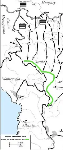 As the Germans and their allies advanced, the Serbians retreated. Although the loss of Niš, Kragujevac, Kruševac, and Kraljevo had cost the Serbians a tremendous quantity of equipment and had made a retreat inevitable, the Serbian army retained its organizational integrity as its rearguards managed to hold off the advancing forces of the Central powers.[16] The Serbian armies reached Priština and Kosovo ahead of their pursuers. The Serbians had also taken a large number of Austro-Hungarian prisoners with them, and there were also a great many civilian refugees.[17] The Serbians had two courses open to them, fight or retreat. Buoyed by the recent successful counterattack against the Bulgarians at Leskovac, making a final stand on the Field of Blackbirds also resonated with Serbians from a historical and national standpoint,[lower-alpha 2] but a retreat to Prizren and from there across the mountains to the Adriatic coast where the army could rest and refit was the chosen course of action. Putnik gave the order to retreat on 22 November.[17]