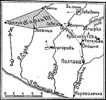- ↑ Robert Petre writes: "I counted from the town of Gorodnoye, where the massacre began [sic], to Krasnokutsk, 639 killed (...) in the town of Krasnokutsk, where we arrived at 10 o'clock in the morning (...) I counted 115 killed, all of which had been pierced by Drabant-swords"; since he counted these bodies at the last place [Gorodnoye], Petre must have mixed up the names.[2] Norsbergh writes: "the king rode into the town of Krasnokutsk with the cavalry and immediately started cutting down the enemies (...) they retreated, one part past Gorodnoye to the right, and the other to the left through its suburb with Charles XII, the Drabants, and a regiment of dragoons, hot on their heels. With drawn swords, the enemies were chased through the narrow streets and relentlessly massacred."[12] According to Nordberg, an additional 400 Russians also died when they fell through the ice on the Merla River.[10]
