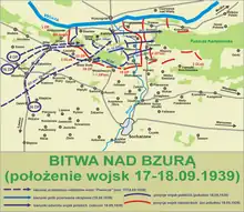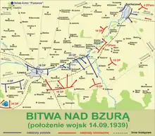 The Battle of the Bzura (or the Battle of Kutno) was the largest Polish counter-attack[3] of the German invasion of Poland and was fought from 9 to 19 September.[4][5] The battle took place west of Warsaw, near the Bzura River. It began as a Polish counter-offensive, which gained initial success, but the Germans outflanked the Polish forces with a concentrated counter-attack. That weakened Polish forces and the Poznań and Pomorze Armies were destroyed. Western Poland was now under German occupation.[6]: 65–70 The battle has been described as "the bloodiest and most bitter battle of the entire Polish campaign".[7] Winston Churchill called the battle an "ever-glorious struggle".[8]