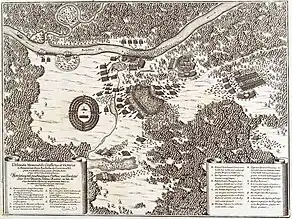 When Prince Janusz Radziwiłł learned of the approaching of the Zaporozhian Cossack’s reinforcements under the command of Colonel Mykhailo Krychevsky, he sent 2,000 men of the Zaporozhian Cossack’s cavalry to scout and destroy the enemy, but Colonel Mykhailo Krychevsky avoided them and attacked the main Polish–Lithuanian Commonwealth’s forces.[1] The Zaporozhian Cossack’s assault was however broken by the Crown Army infantry and artillery fire. Then Prince Janusz Radziwiłł assaulted the Zaporozhian Cossacks with his Polish–Lithuanian cavalry, but it was encircled by the Zaporozhian Cossacks and would have been destroyed if the rest of the Polish–Lithuanian Commonwealth’s cavalry, returning from the failed scouting mission, hadn't arrived at that moment and turned the tables.[1]