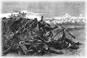 With cheers the company ran forward in half columns. The Prussians with their breech-loading rifles fired 3 salvos (the first at 200 meters' distance), stopping the attack 20 meters in front of the earth dike. The Danish lost 98 men, three-quarters of their force, against three wounded Prussians.