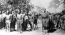In the Kalamata Province, the nascent communist-led National Liberation Front (EAM) began its activity in 1942, promoting passive resistance to the unpopular confiscation of crops by the Italian military authorities, and began the first steps to form partisan troops.[5][6] The first left-wing groups formed across the Peloponnese; their engagements were limited to skirmishes with the Greek Gendarmerie and the Italian Army, and by late 1942 they were almost all either destroyed or forced to evacuate to Central Greece.[7] In April 1943, when the Peloponnese was considered "partisan-free" by the occupation authorities, the wing commander Dimitris Michas, who had previously been imprisoned by the Italians, formed a new partisan group on orders from EAM. Following his first successes, and with the arrival of reinforcements requested from the mainland, the group grew and began openly attacking Italian soldiers and their Greek informants.[7][8][9] By June 1943, the number of Greek People's Liberation Army (ELAS) partisans in the Peloponnese reached about 500 men in total. Due to the lack of a central command and the difficulties of communication, they were dispersed and operated as quasi-autonomous groups.[10] In August 1943, according to a German intelligence report, partisan activity spiked in the mountainous areas of Messenia, where 800 men under Kostas Kanellopoulos operated.[11]