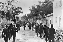 The end of the battle was followed by the invasion of Meligalas by civilians, and an unchecked plunder and massacre,[90] by a multitude of relatives of the Battalionists's victims who sought revenge.[91] According to a contemporary report preserved in the archives of the Communist Party of Greece (KKE), these were inhabitants of the village of Skala, which had been torched by the German army.[92] Among the captive Battalionists held in the bedesten, Velouchiotis—who arrived at Meligalas shortly after the end of the battle with his personal escort[46]—recognized a gendarme whom he had previously arrested and then released, and ordered his execution.[93] The first reprisal wave, tacitly encouraged by ELAS through the deliberately loose guarding of its captives,[94] was followed by a series of organized executions.[17][93]