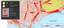 The city's leadership reportedly surrendered Melitopol later on 25 February, with Russian forces occupying the city.[9] However, Ukrainian forces later launched a counterattack on the city, with locals reporting volleys of shelling and tanks with Russian national flags in the streets.[10] Russia claimed on 26 February that it had taken the city,[11] though James Heappey, the British Armed Forces Minister, said that the Russian claim could not be substantiated.[12]