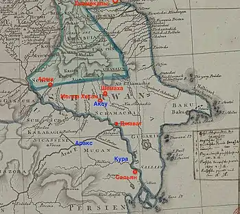 The battle for Shamakhi began on 9 November 1578 and lasted for several days.[8][11] On the morning of the third day, the brother of the Crimean Khan, Adil Giray, at the head of 15 thousand Tatar horsemen, came to the aid of the Ottomans, this decided the outcome of the battle and the Safavids were defeated.[2][12][13] Aras Khan and his son were taken prisoners by the mirakhur Adil Giray and were executed.[5][10][14] The losses on both sides were enormous.[9][15]