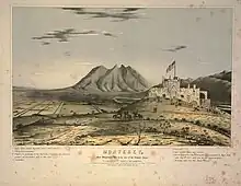 Besides the citadel, Mexican strong points within the city included the "Black Fort" (Col. Jose Lopez Uraga, 3d & 4th Line and 9 guns – incl. "San Patricio" Battery); "the Tannery," La Teneria, (2d Ligero under Col. José M. Carrasco and part of the Querétaro Battalion, and 2 guns & 1 mountain howitzer – Lt (?) J. Espejo) El Fortín del Rincón del Diablo (Lt. Col. Calisto Bravo and 3 guns- Capt. Ignacio Joaquin del Arenal); La Purísima bridge and tete-de-pont (Activos of Aguascalientes under Col. Jose Ferro and the Querétaro under Comdte. José María Herrera 3 guns – Capt. P. Gutierez).[1]: 92 West of the city atop Independencia stood Ft. Libertad ( 4 guns) and the Obispado (bishop's place) with the Activos of Mexico commanded by Lt. Col. Francisco de Berra and 3 guns and 1 howitzer, and atop Federacion was a redan(2 guns) and Fort Soldado.[1]: 93 In reserve at la Plaza was the 3d Ligero under Lt. Col. Juan Castro and 1 gun – Lt. Agustín Espinosa.