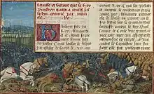 The Battle of Montgisard was fought between the Kingdom of Jerusalem and the Ayyubid Dynasty on 25 November 1177 at Montgisard, in the Levant between Ramla and Yibna.[4] The 16-year-old Baldwin IV of Jerusalem, severely afflicted by leprosy, led outnumbered Christian forces against Saladin's troops in what became one of the most notable engagements of the Crusades. The Muslim Army was quickly routed and pursued for twelve miles.[5] Saladin fled back to Cairo, reaching the city on 8 December, with only a tenth of his army.[2] Muslim historians considered Saladin's defeat to be so severe that it was only redeemed by his victory ten years later at the Battle of Cresson, the Battle of Hattin and the Siege of Jerusalem in 1187, although Saladin defeated Baldwin IV in the Battle of Marj Ayyun and the Siege of Jacob’s Ford in 1179, only to be defeated by Baldwin IV again at the Battle of Belvoir Castle in 1182 and the Siege of Kerak in 1183.[2]