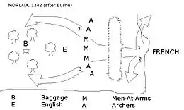 Jonathan Sumption[2] gives an alternative description of the battle which, while not contradicting Burne's battle order for the English, depicts the actions of the French nobility in a way that is far more in line with other battles of the 100 Years War.