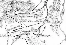 A few border skirmishes took place after the declaration of war and German reconnaissance patrols found that the French had a chain of frontier posts, supported by larger fortified positions further back. After 5 August, more patrols were sent out as French troops advanced from Gérardmer to the Col de la Schlucht (Schlucht Pass), where the Germans retreated and blew up the tunnel.[10] Joffre had directed the First and Second armies to engage as many German divisions as possible to assist French forces operating further north. The French VII Corps (General Louis Bonneau) with the 14th Division (General Louis Curé), the 41st Division (General Paul Superbie) with the 8th Cavalry Division (General Louis Aubier) on the flank.[13] The French advanced from Belfort to Mulhouse and Colmar 35 km (22 mi) to the north-east but were hampered by the breakdown of the supply service and delays. The French seized the border town of Altkirch 15 km (9.3 mi) south of Mulhouse with a bayonet charge for a loss of 100 men killed.[14][lower-alpha 1]