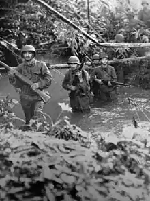 On 22 July, Griswold issued orders for an offensive aimed at capturing Munda airfield.[17] On 23 July, the U.S. 43rd Infantry Division was reinforced by the 37th and 25th Infantry Divisions. These divisions were commanded by Major Generals Robert S. Beightler and J. Lawton Collins.[18][19] The following day, the U.S. preparations for the offensive were completed. The 37th was deployed inland with three regiments, the 145th,161st and 148th, positioned along the front from south to north. On their left, along the coast, the 43rd Infantry Division pushed two regiments forward, the 103rd and 172nd, and held the 169th back in reserve.[16][20] In total, U.S. forces assigned to the effort to capture Munda numbered around 30,000 men. Seven infantry regiments were ultimately committed from three different divisions.[1][21]