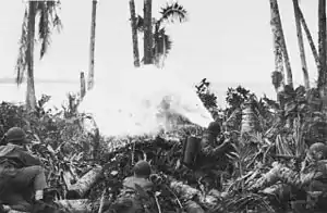 ![]() U.S. Army soldiers attack Japanese fortifications with flamethrowers on or around 1 August 1943 during the battle for the airfield. | |||||||